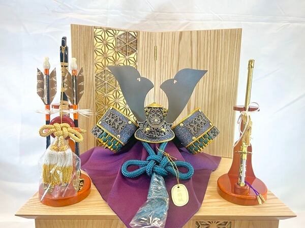 ● 兜を引き立てる綺麗な白木の木目・寄木の屏風がセットです。
