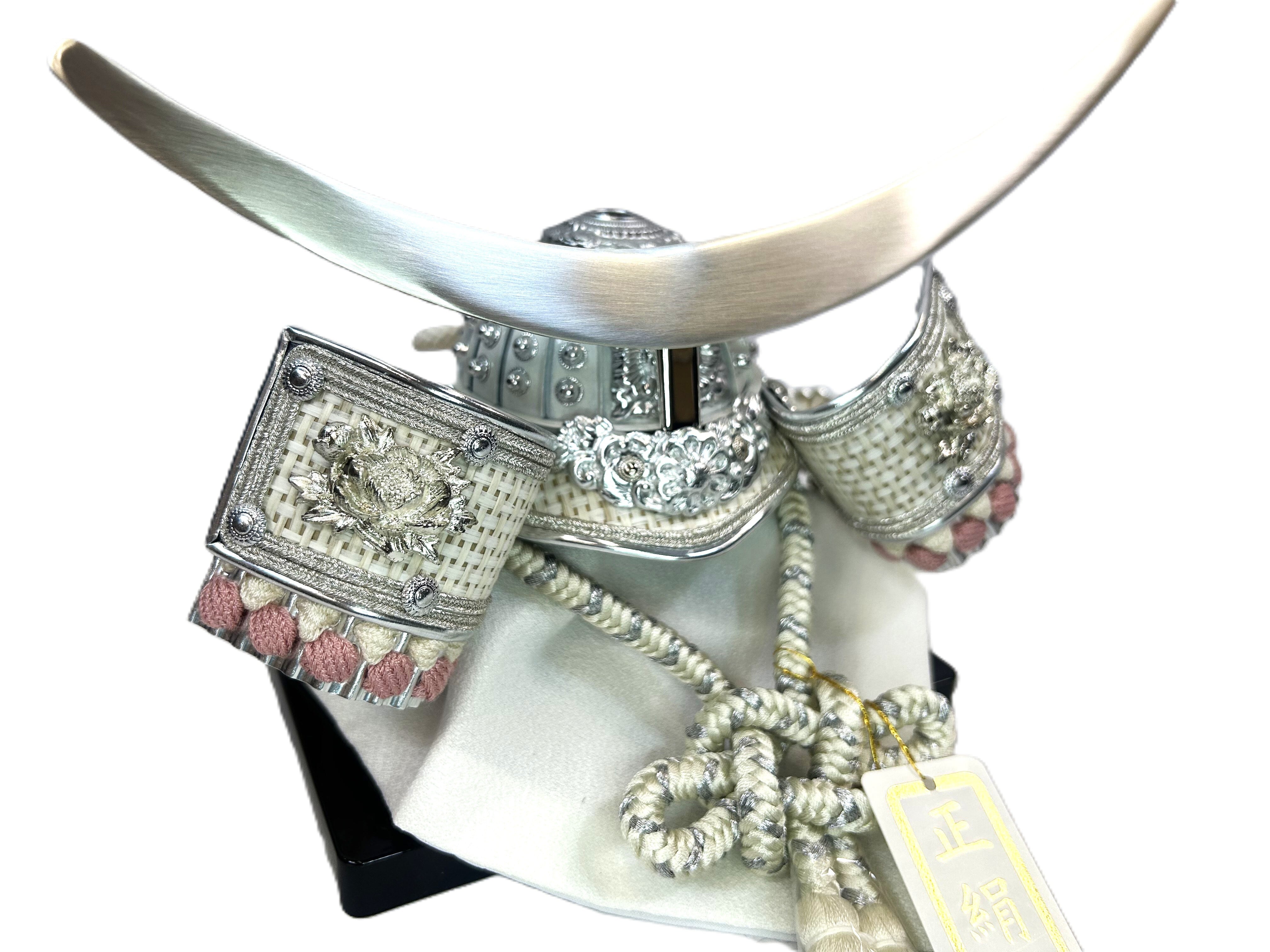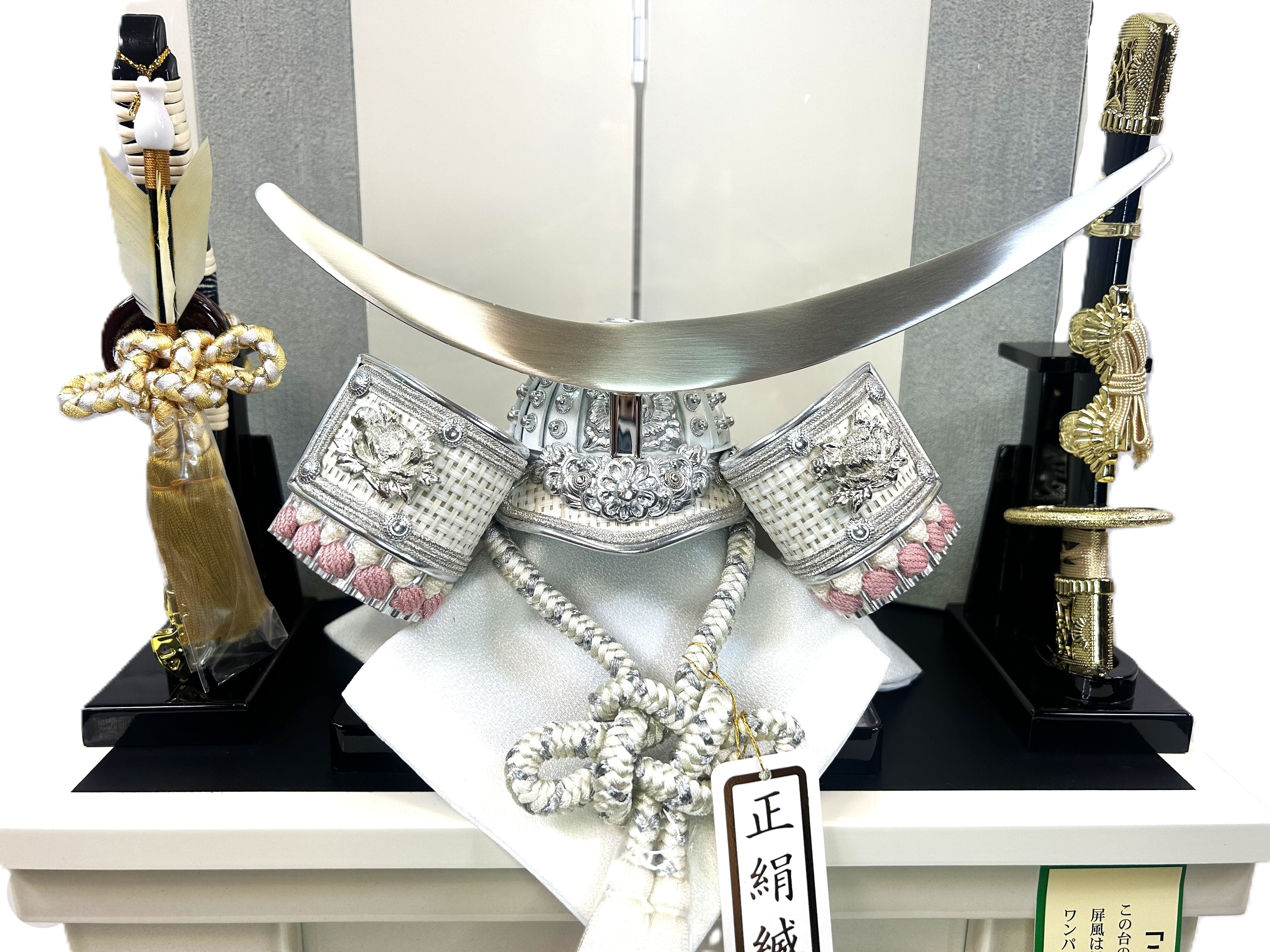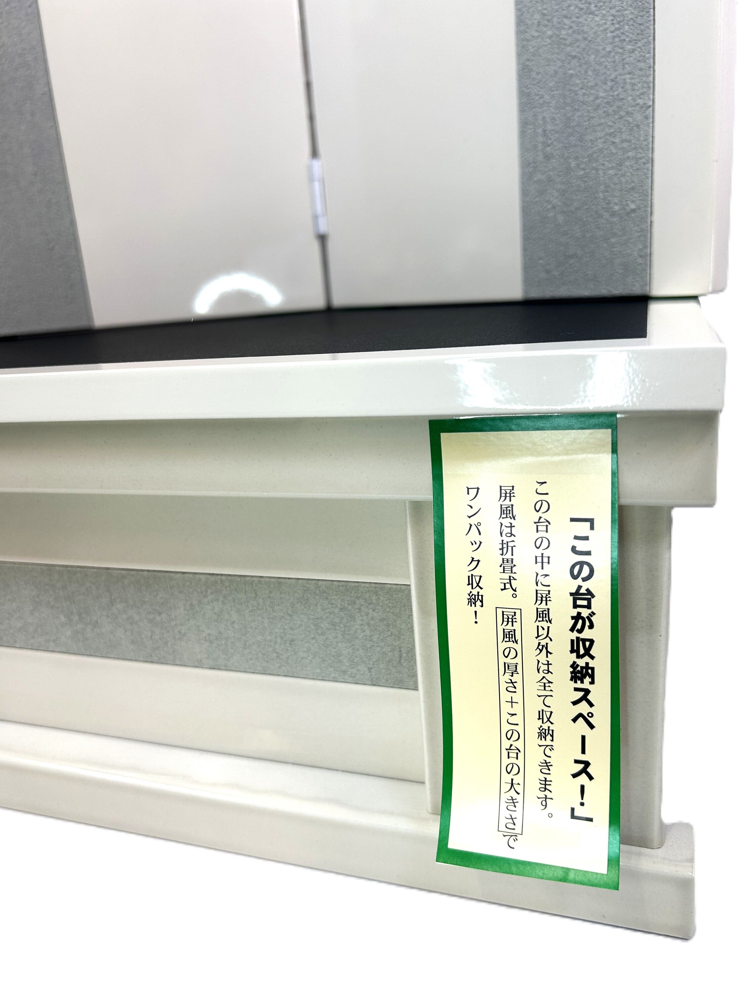 ● 兜を引き立てる綺麗な白とグレーの屏風と飾り台です。