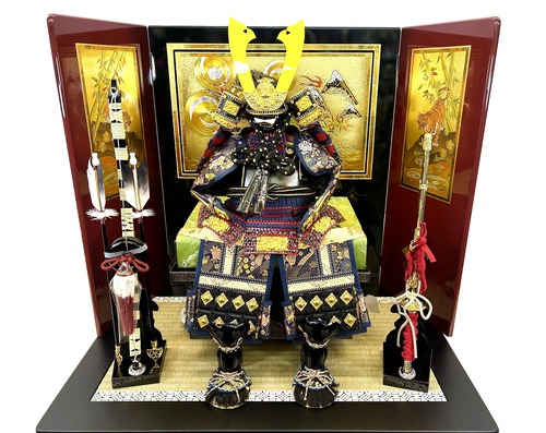 7号 704 赤備之 紺 紺革小桜威 鎧 屏風 弓太刀 飾り台 付き 五月人形 兜飾り コンパクト 端午の節句 初節句 お祝い こどもの日 海外へのお土産 こだわりの兜 日本文化 日本伝統 日本土産 菖蒲の節句 節句飾り かぶと 虎 龍 竜 伝統工芸