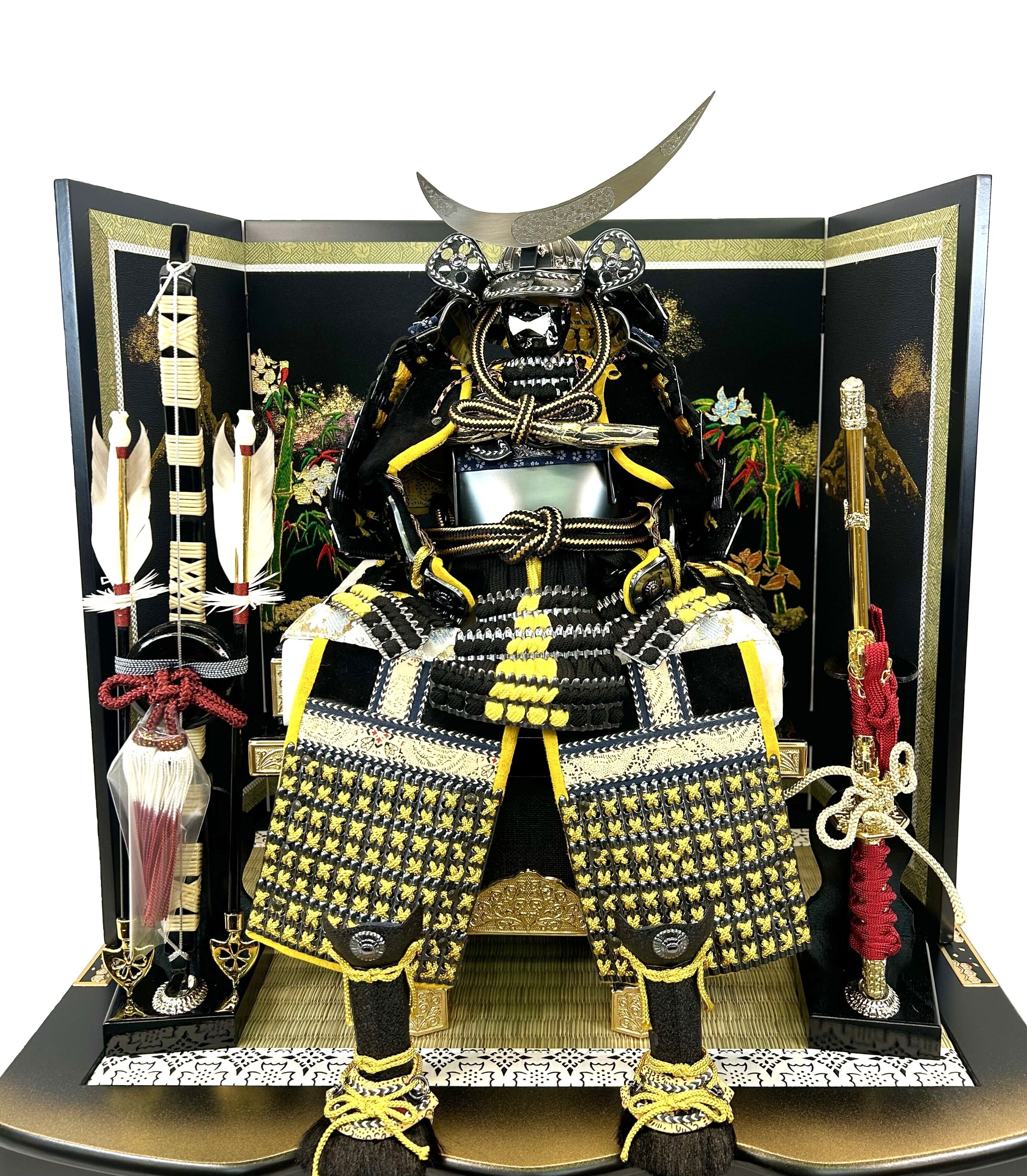 5号 52 黒黄伊達ブロンズ 伊達政宗 鎧 屏風 弓太刀 飾り台 付き 五月人形 鎧飾り 鎧 戦国武将 戦国武将の兜 兜飾り コンパクト 端午の節句 初節句 お祝い こどもの日 海外へのお土産 こだわりの兜 日本文化 日本伝統 日本土産 菖蒲の節句 節句飾り かぶと 虎 龍 竜 伝統工芸