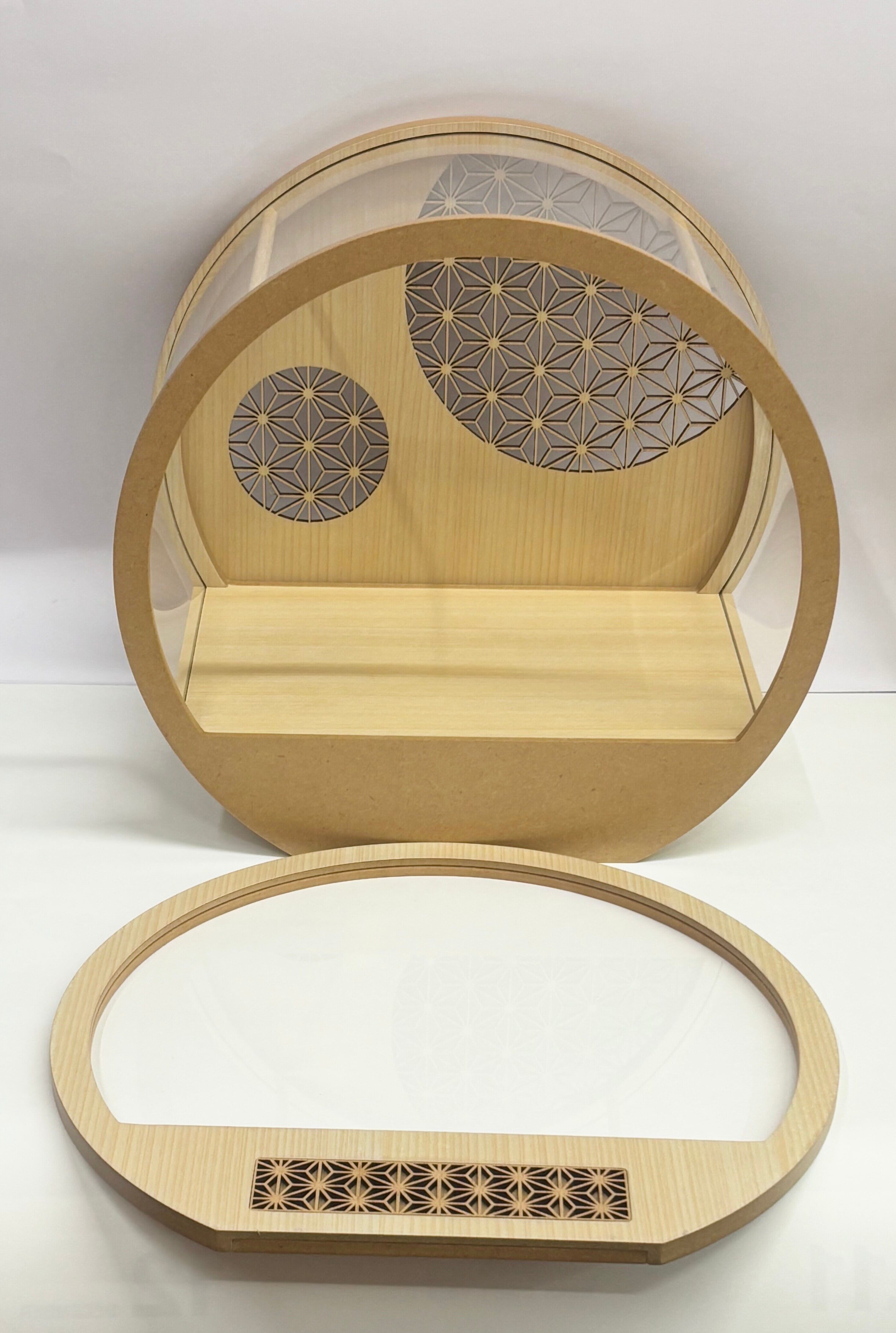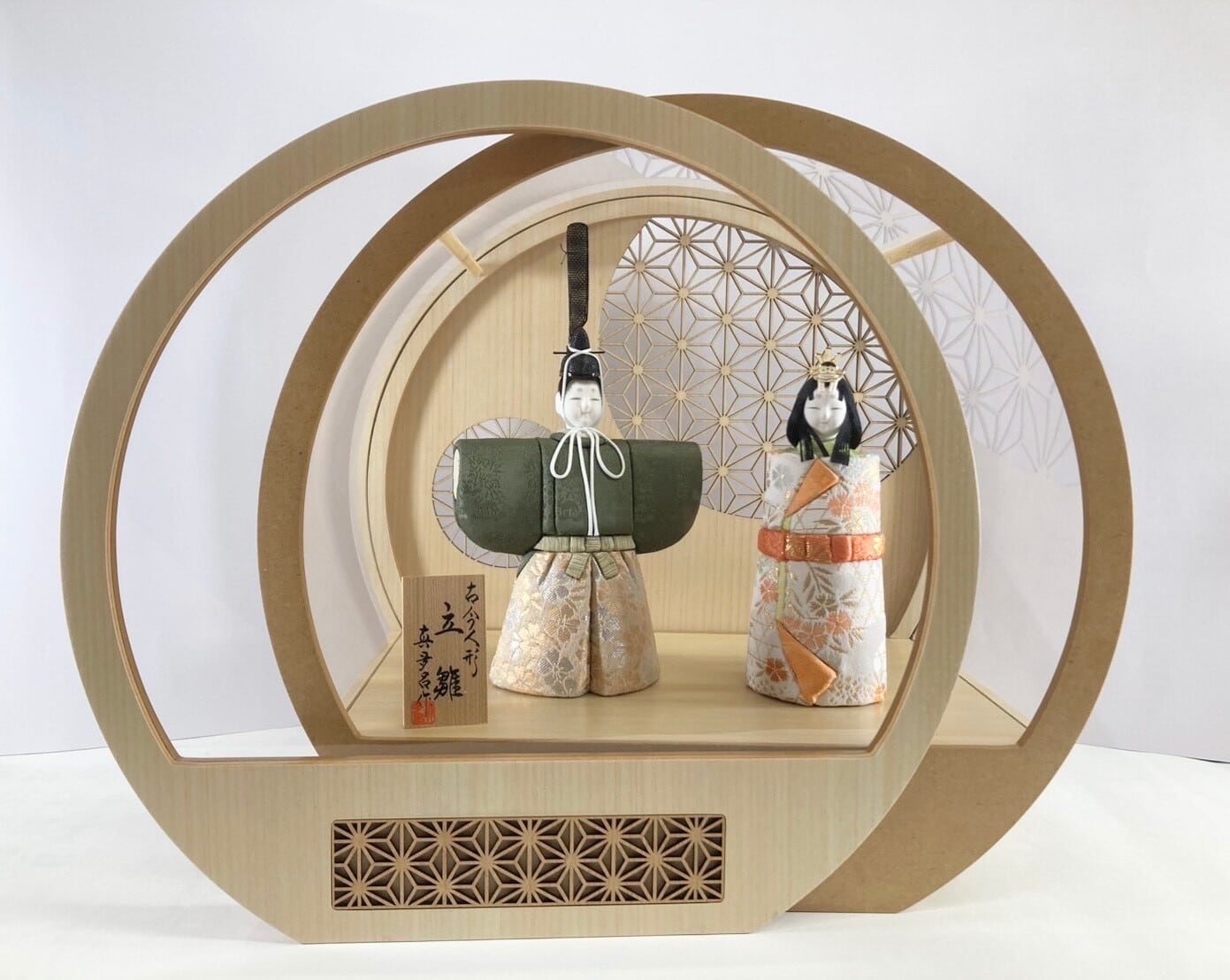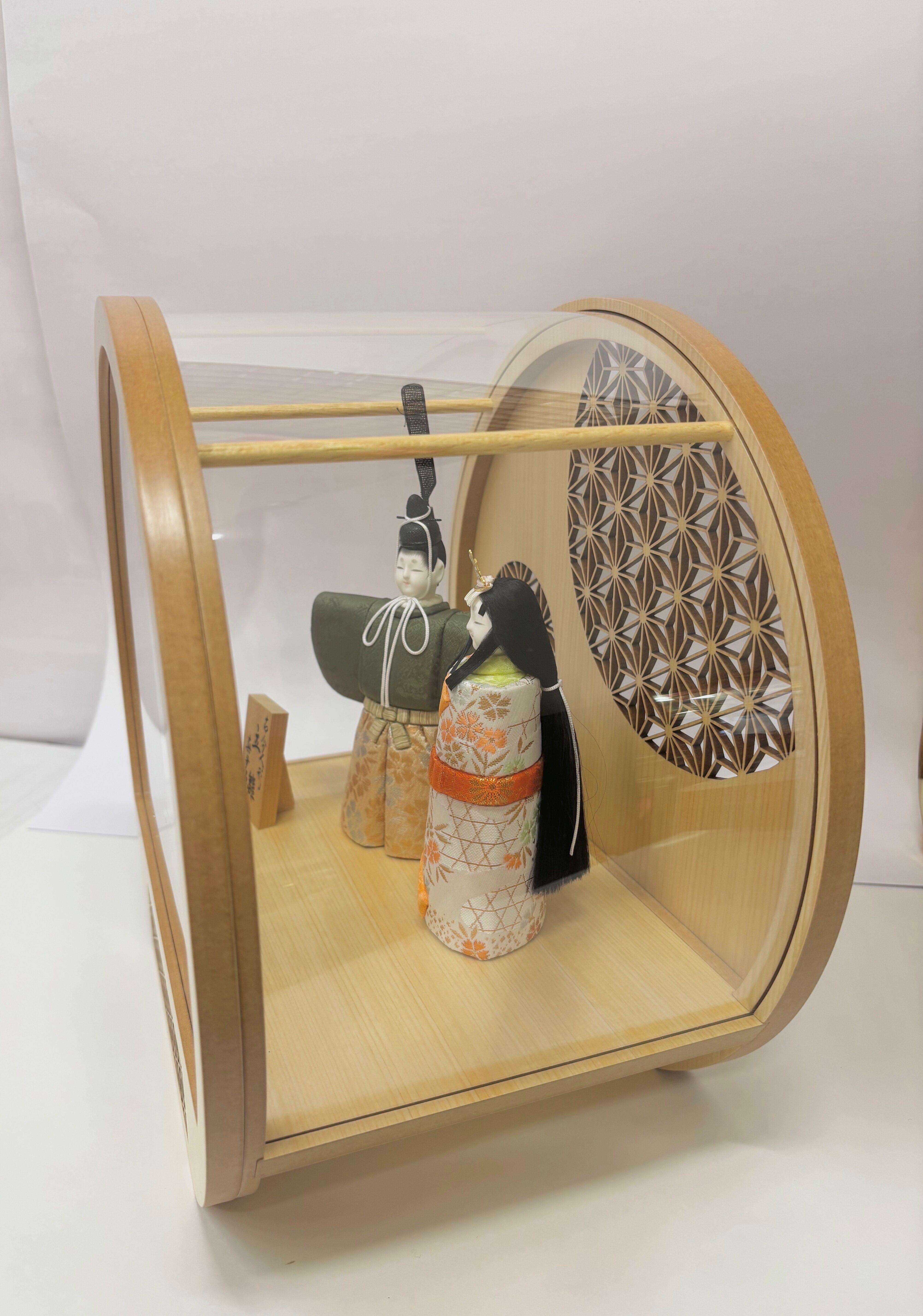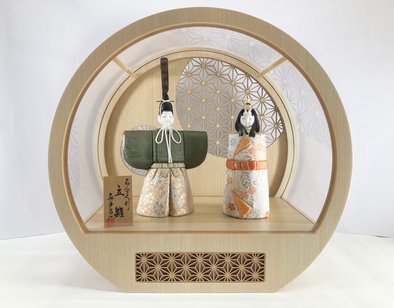 金林真多呂 木目込雛 立雛 麹塵染め 親王飾り 6283 桧ナチュラル 麻の葉レーザー彫刻 30丸型前開きアクリルケース 雛人形 道具 コンパクト 桃の節句 初節句 お祝い こどもの日 海外へのお土産 こだわりの人形 日本文化 日本伝統 日本土産 節句祝い 節句飾り 伝統工芸 プレゼント ギフト ケース飾り