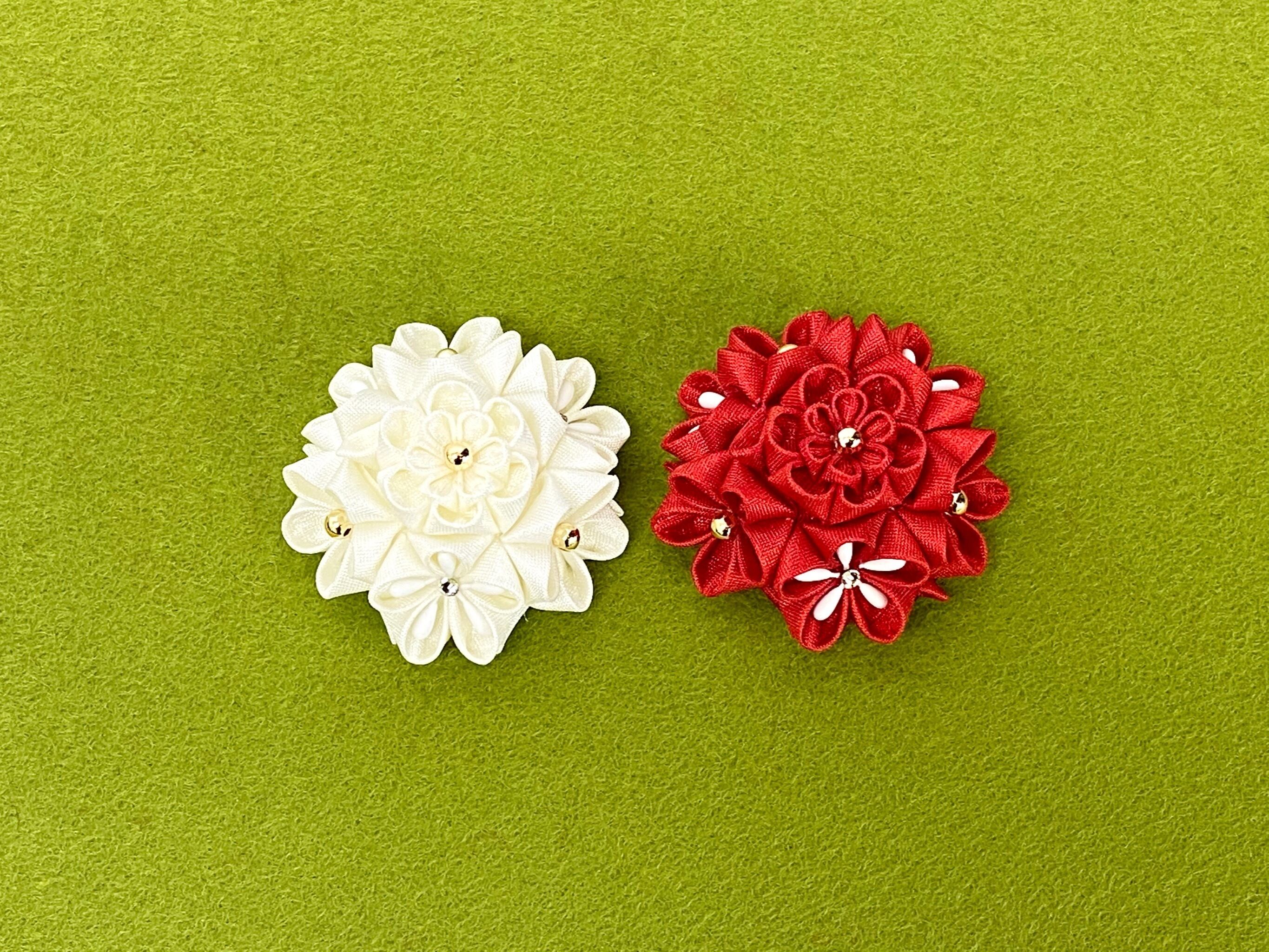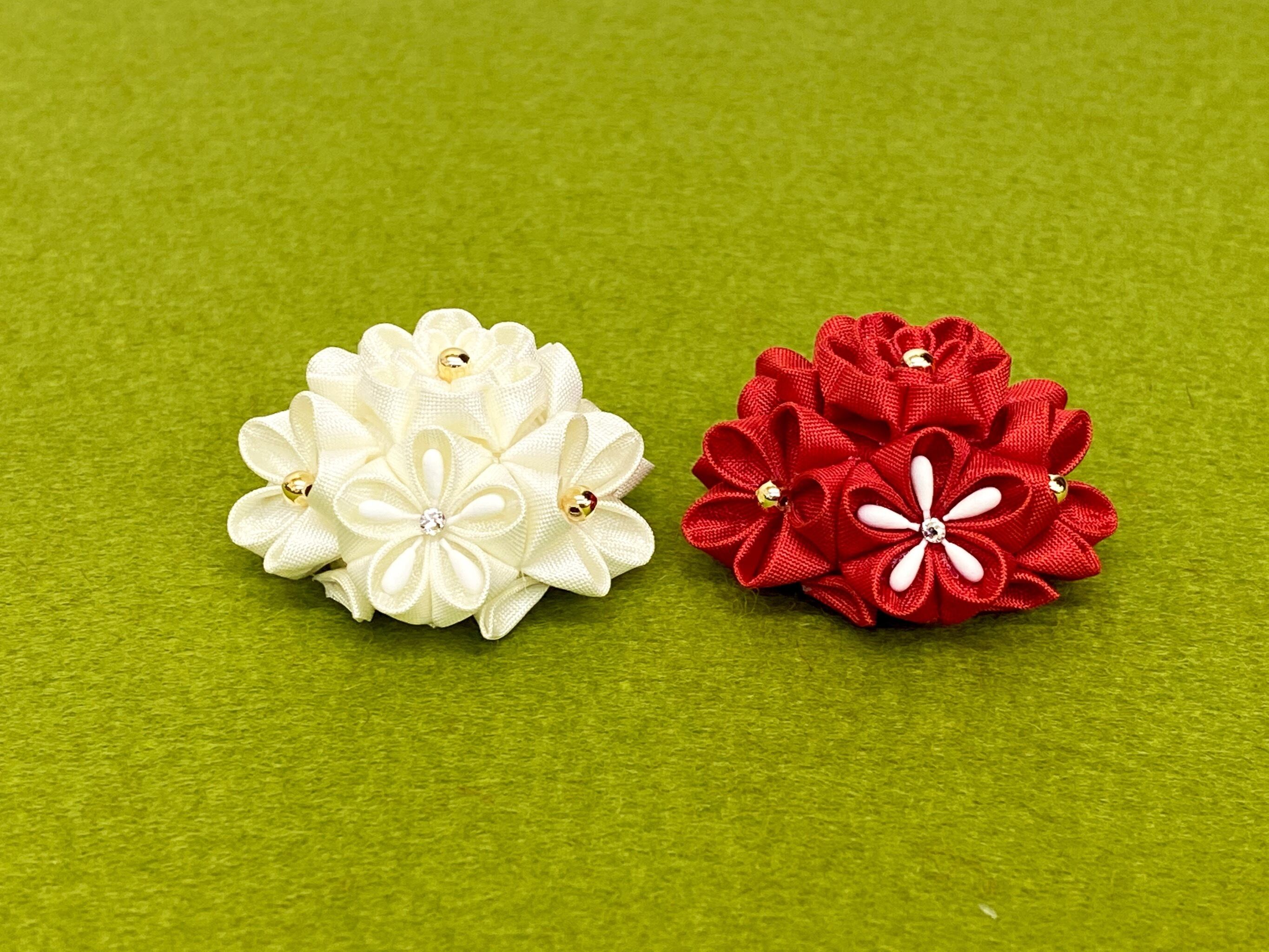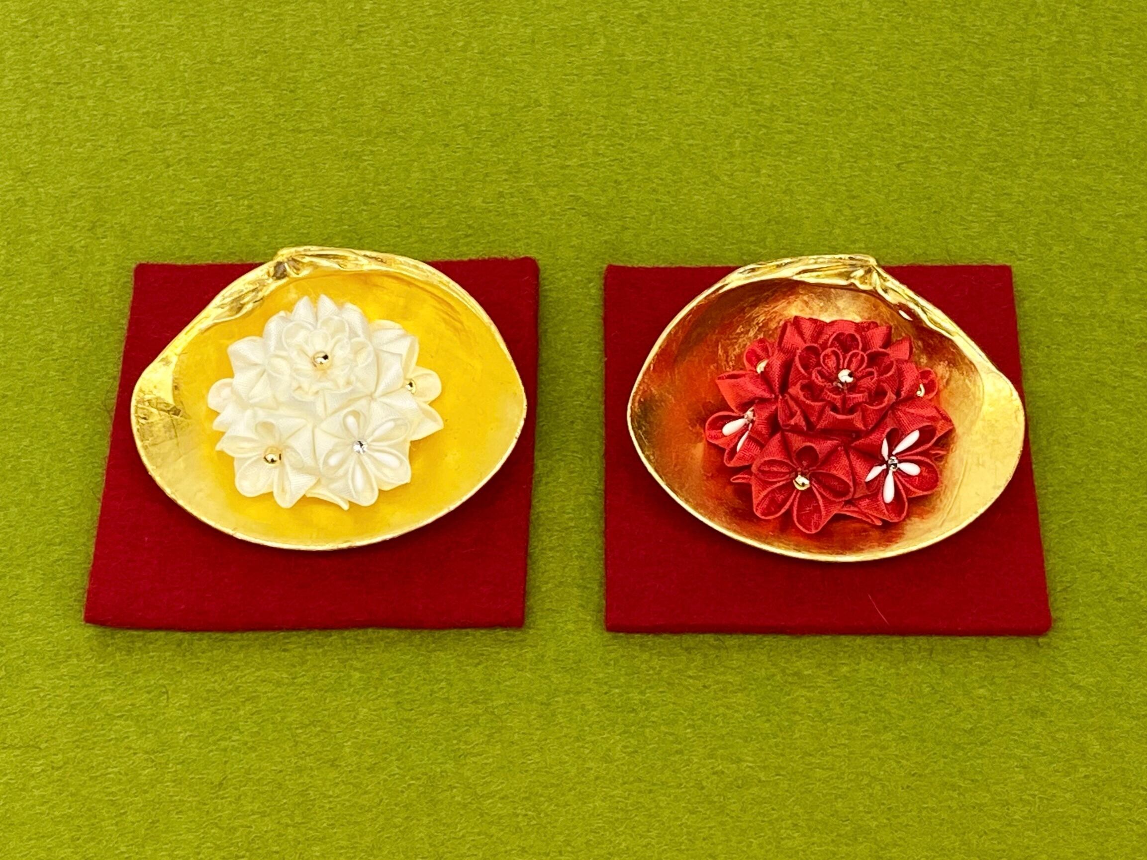 蛤に収まるように職人さんにお願いしてつまみ細工を作ってもらいました。
