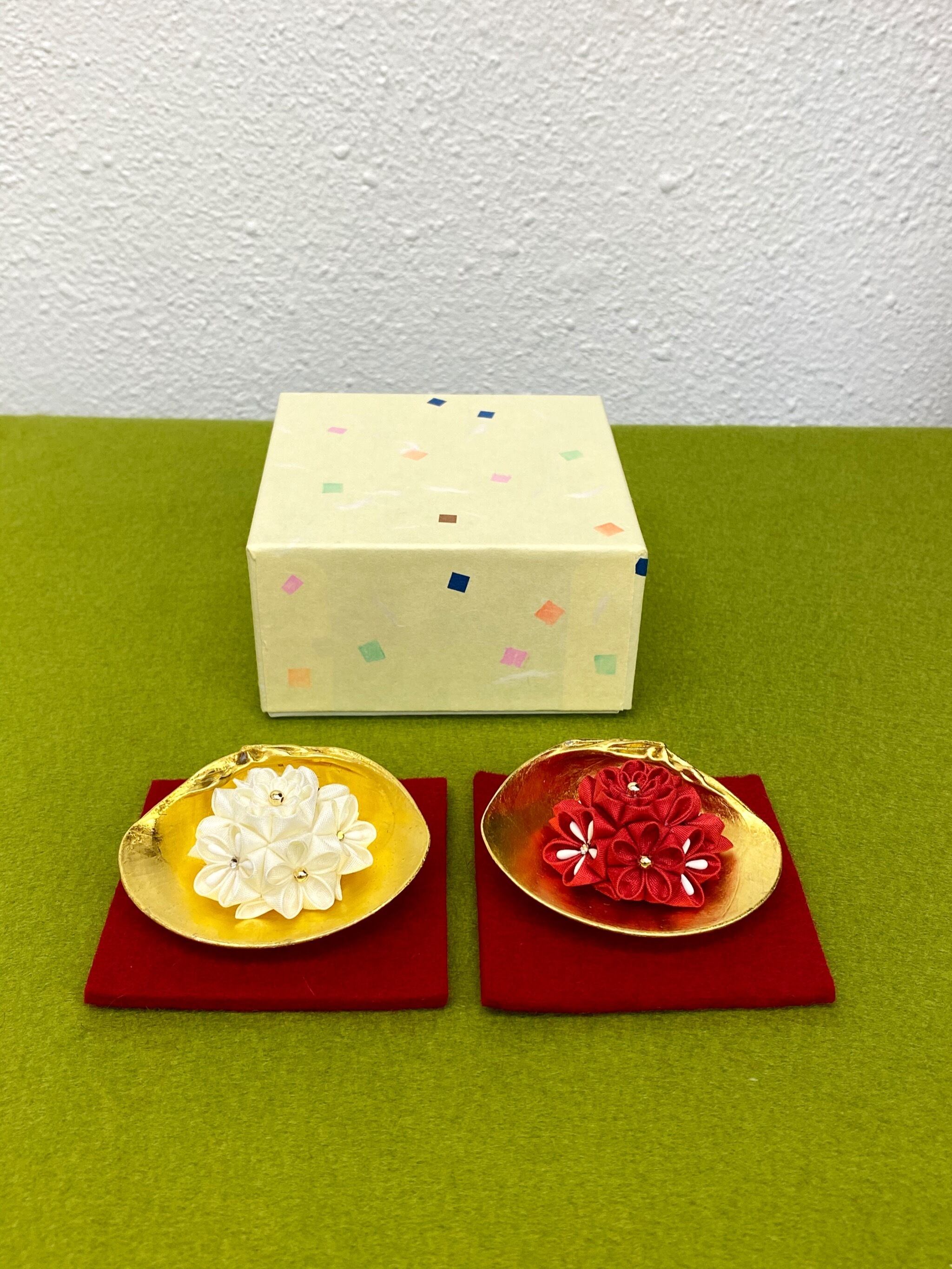 蛤香合◇純金箔◇つまみ細工◇紅白盛花◇小