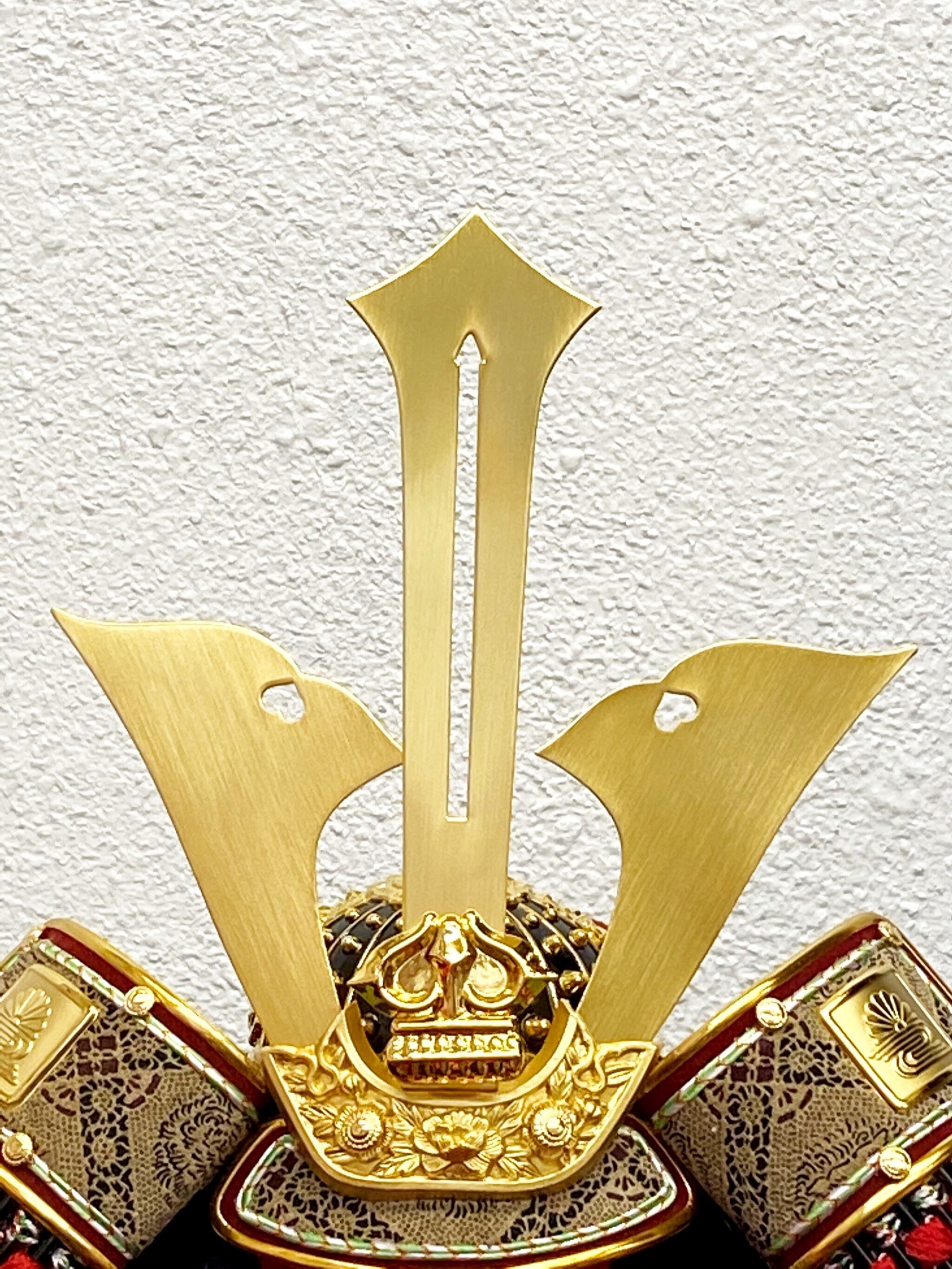 中央に不動明王の象徴といわれている剣を立てた三ツ鍬形、吹き返しには菊水(きくすい)の紋が有名です。