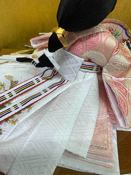 ● 格式高く縁起の良い有職文様の一つ、雲立涌向鶴文様(くもたてわくむかいづるもんよう)のお衣装をお召しになられたお雛様です。