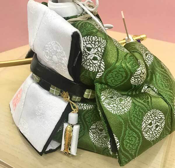 ● 緑色の唐織衣装は厄除け・健康を象徴します。昔から緑色には、新緑=ハハコグサ(母子草:春の七草として粥に入れたり、餅に混ぜて草餅にする。また、薬草として咳止めや去痰の薬用にも利用できる) / 厄除け / 健康を示します。菱餅の色に、緑色が必ず色付けしているのも同じ意味になります。