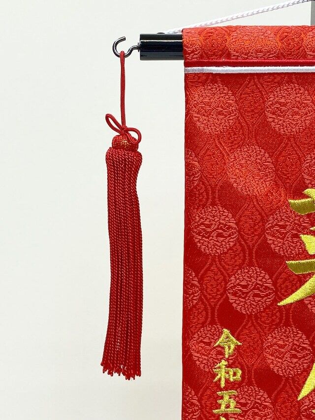 ・赤生地に鶴柄の刺繍がかわいい名前旗です。