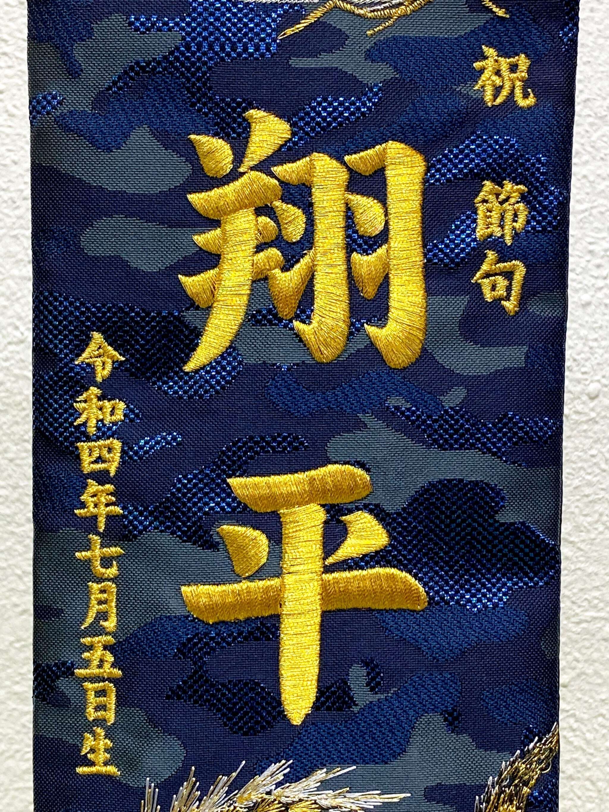 ・名前旗は紺生地に龍の刺繍、金糸でお名前と生年月日をお入れします。
