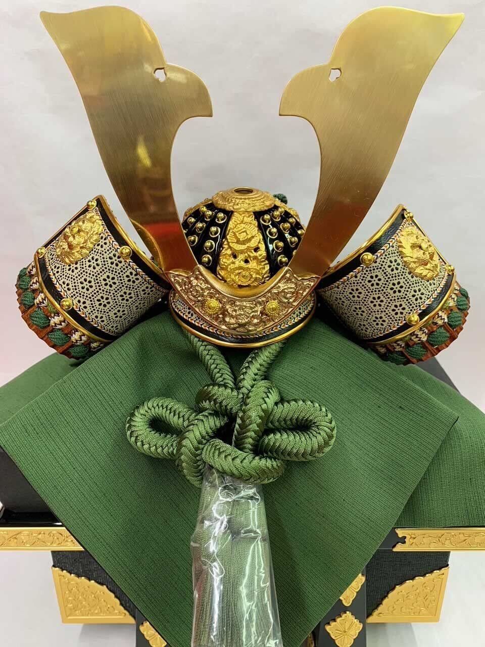 ● 【限定品】三段縅の錣(しころ)、忍び緒、袱紗、全体を緑色で統一した兜飾りです。