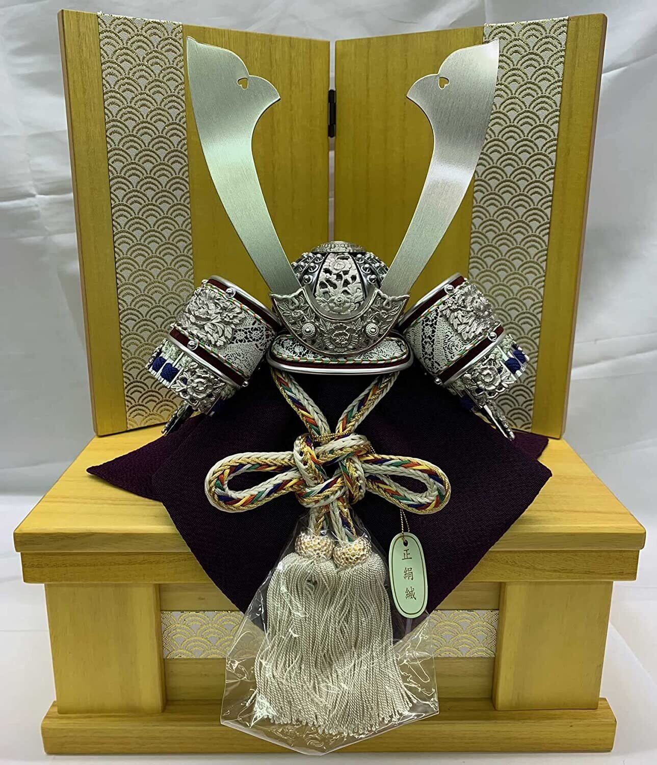 9号 兜 プラチナ箔 段縅 兜飾り 屏風付き収納飾台 6号桐短冊(黄)正絹・合わせ鉢 五月人形 兜飾り コンパクト収納 端午の節句 初節句 お祝い 海外土産 特別限定品