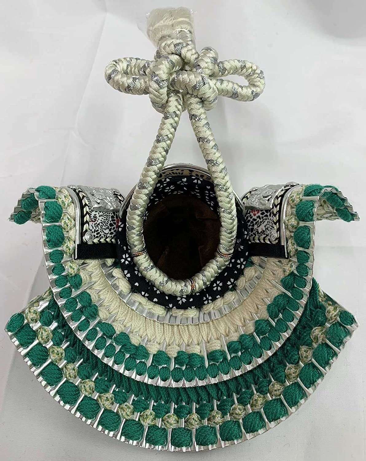 5号兜 明緑中白威 収納箱木目縦ライン(小)屏風二曲和紙円(小)(収納飾台・屏風付き)正絹・合わせ鉢【五月人形】【兜飾り】【端午の節句】【初節句】【お祝い】【海外土産】【特別限定品】