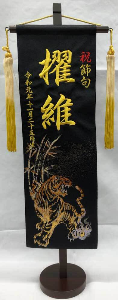【五月人形】黒金襴 行書 バンブータイガー 段染め飾り房 金刺繡 名前旗 (特中)台付【名旗】【虎】【とら】【トラ】【寅】【タペストリー】【名前刺繡】【コンパクト】【かっこいい】【おしゃれ】