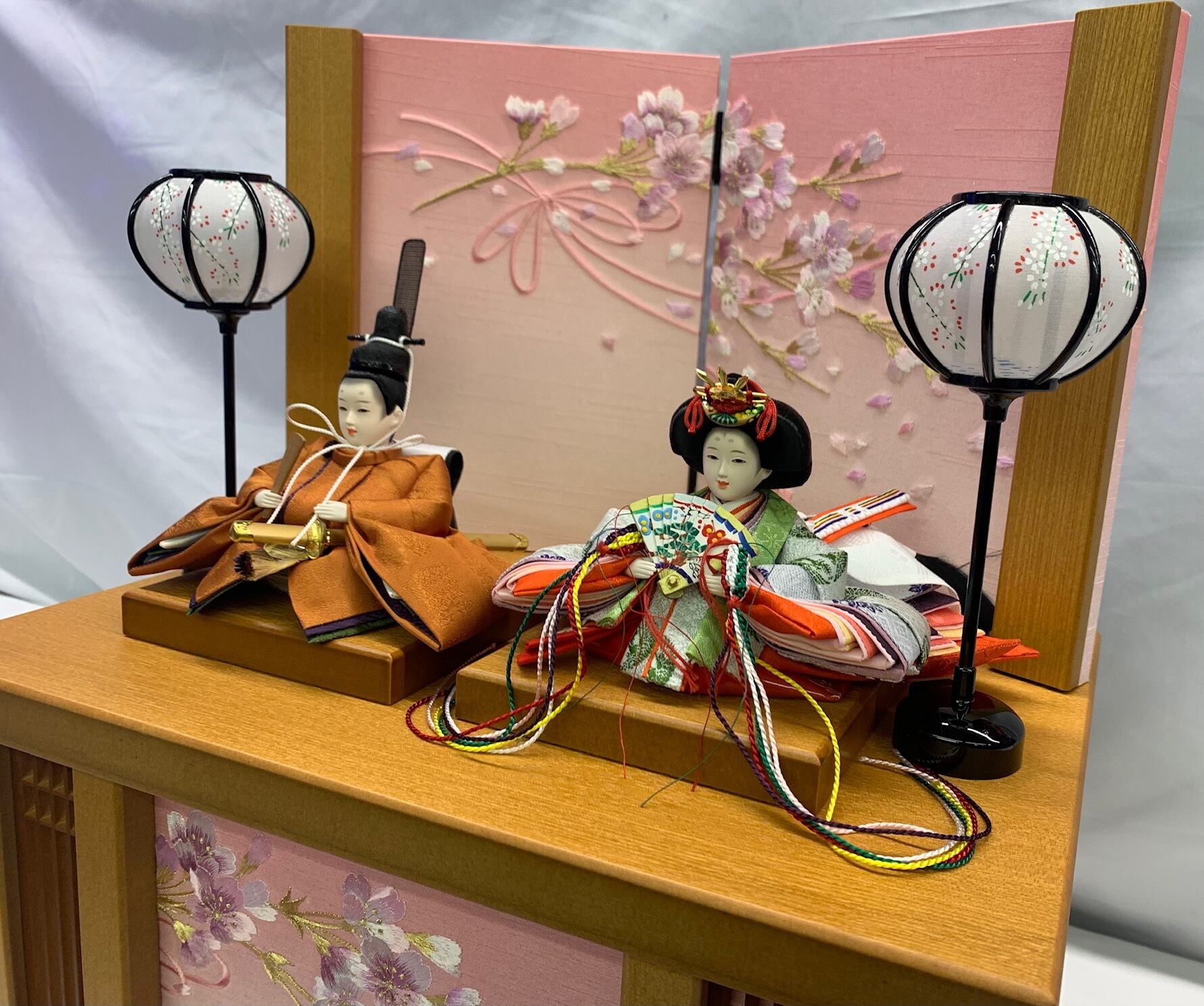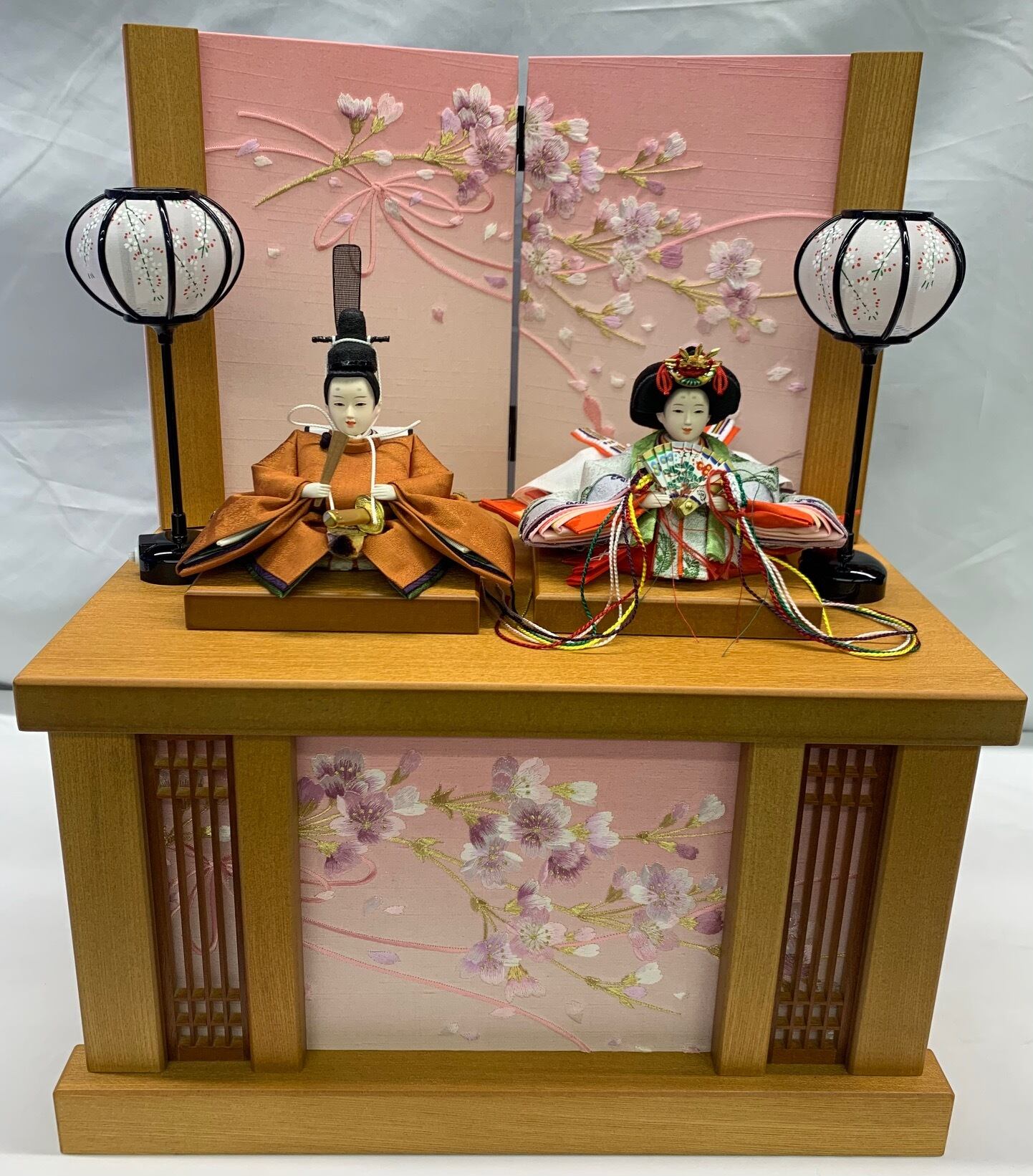 雛人形 まめ 正絹 黄櫨染 上仕立 No.13 S23-2 1R3-2 リボン桜 収納箱 屏風付き ひな人形 ひな飾り 雛飾り 雛祭り ひな祭り 収納飾り コンパクト