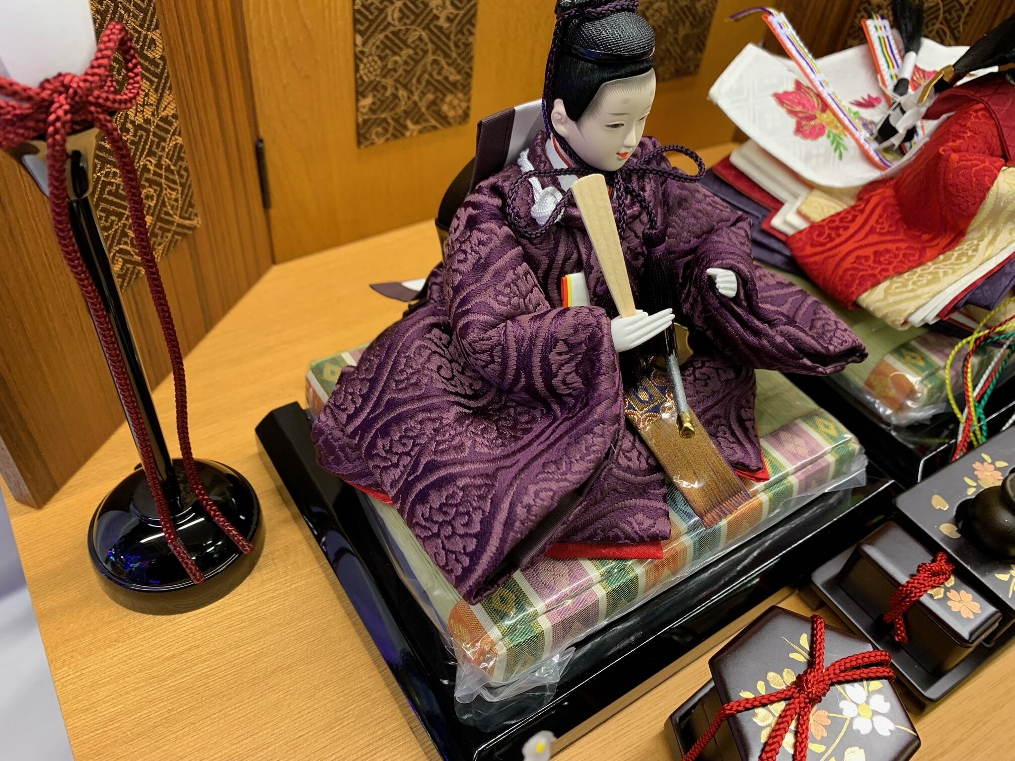 ●格式高く縁起の良い有職文様の一つ、雲立涌向鶴文様(くもたてわくむかいづるもんよう)のお衣装をお召しになられたお雛様です。