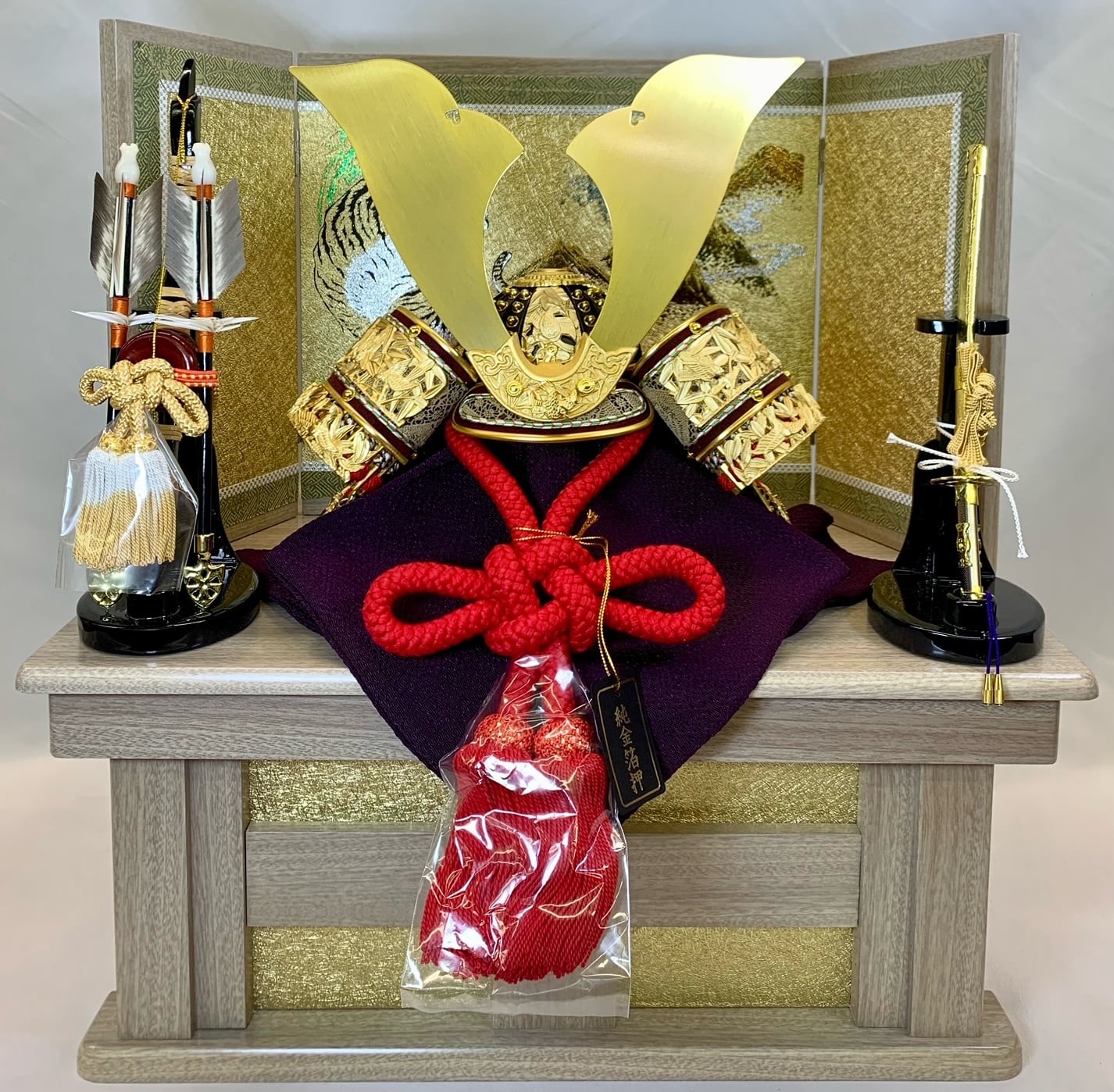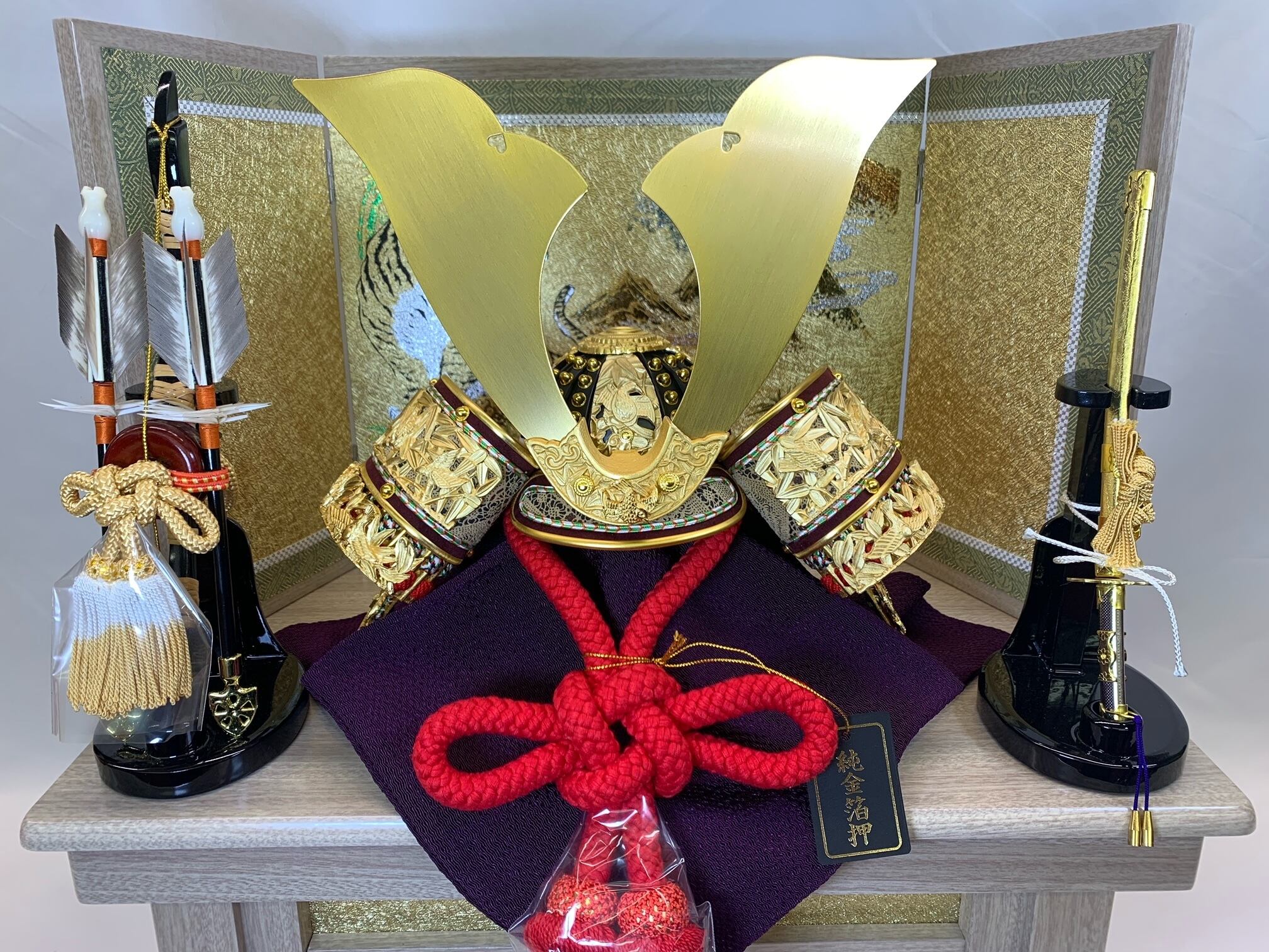 特別限定品 五月人形 10号 純金箔押し 竹雀 兜 合わせ鉢 正絹 弓太刀付 屏風 収納飾り台付 10 かぶと 兜飾り コンパクト 端午の節句 初節句 お祝い 誕生祝い プレゼント コンパクト飾り こどもの日 海外へのお土産 こだわりの兜 日本文化 日本伝統 日本土産 菖蒲の節句 総角結び