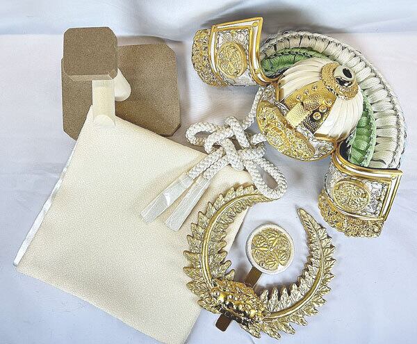 ●白と金色を基調とした中に淡いペパーミントと水色の控えめで上品な兜です。