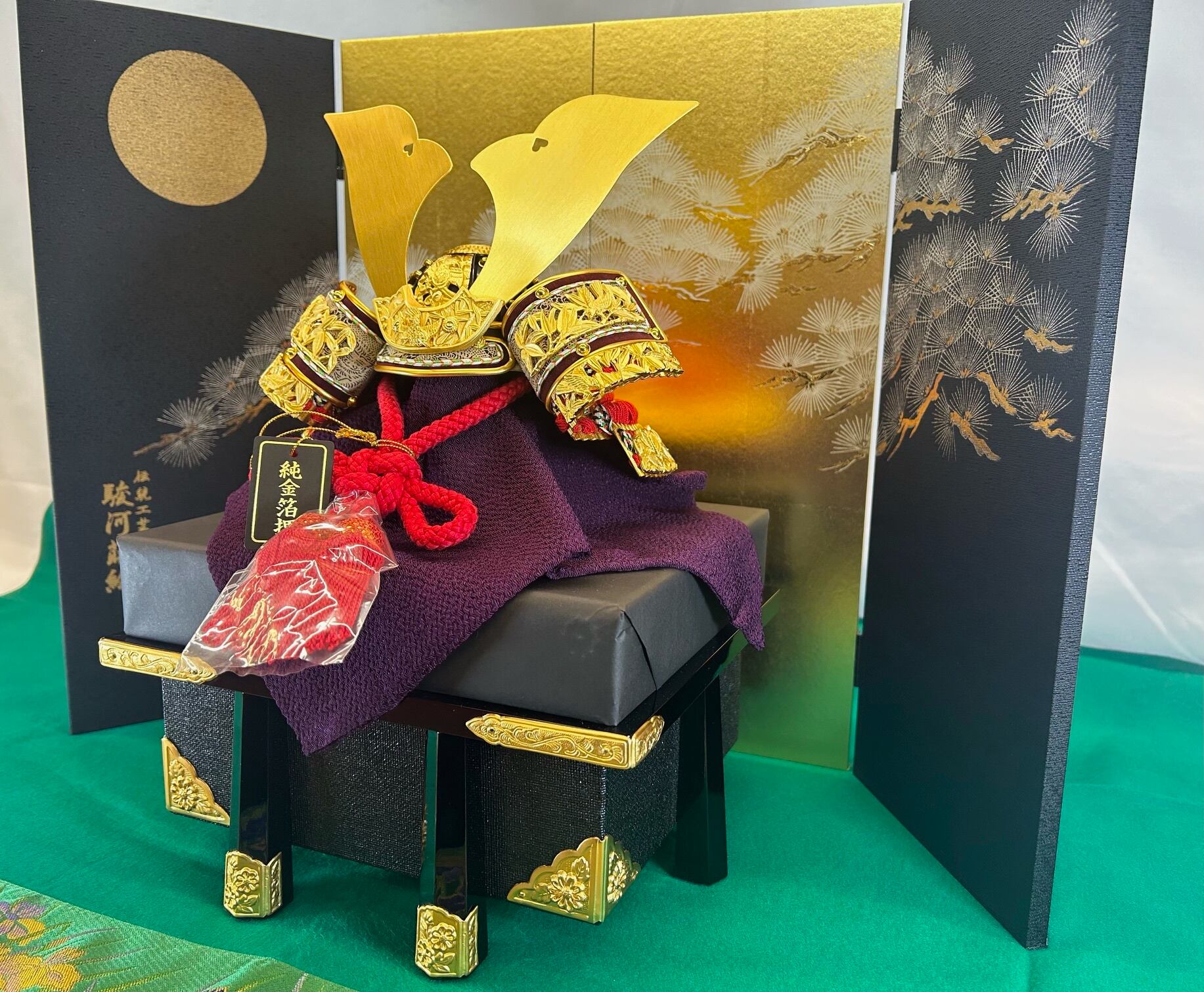 特別限定品 五月人形 8号 純金箔押し 竹雀 兜 合わせ鉢 5月4曲屏風 40cm 黒金銀針松 伝統工芸品 駿河蒔絵 正絹 端午の節句 兜飾り 屏風 五月飾り 端午の節句 初節句 節句 お祝い プレゼント 海外土産 こだわりの兜 日本伝統 コンパクト