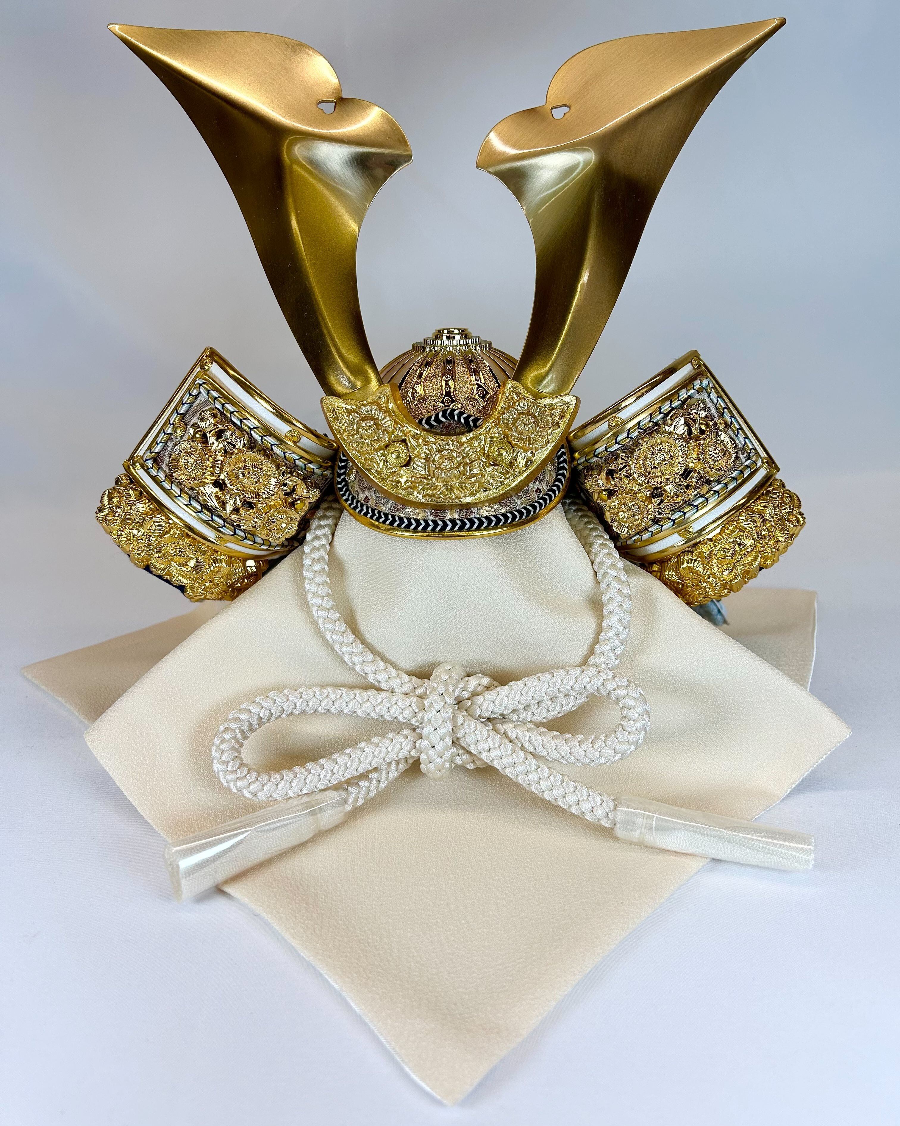 ●白と金色を基調とした中に淡いペパーミントと水色の控えめで上品な兜です。
