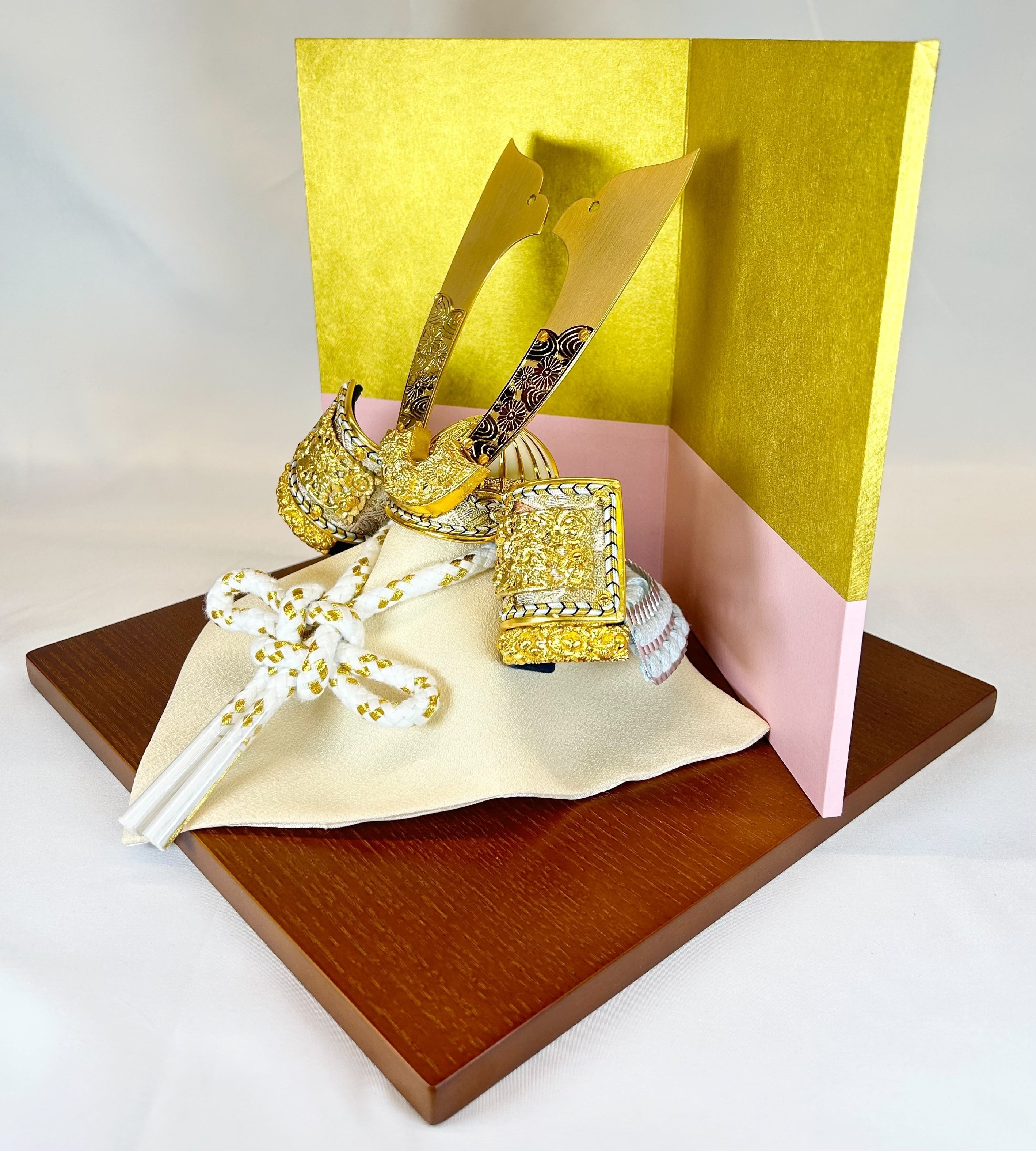 兜 S502 兜 飾り台 木目桜色 50x25 二曲一双 金彩ピンク 屏風 H21x15 五月人形 コンパクト飾り コンパクト収納セット 兜飾り お祝い 初節句 端午の節句 海外土産 プレゼント ギフト 兜 こだわりの兜 日本文化 日本伝統 日本土産