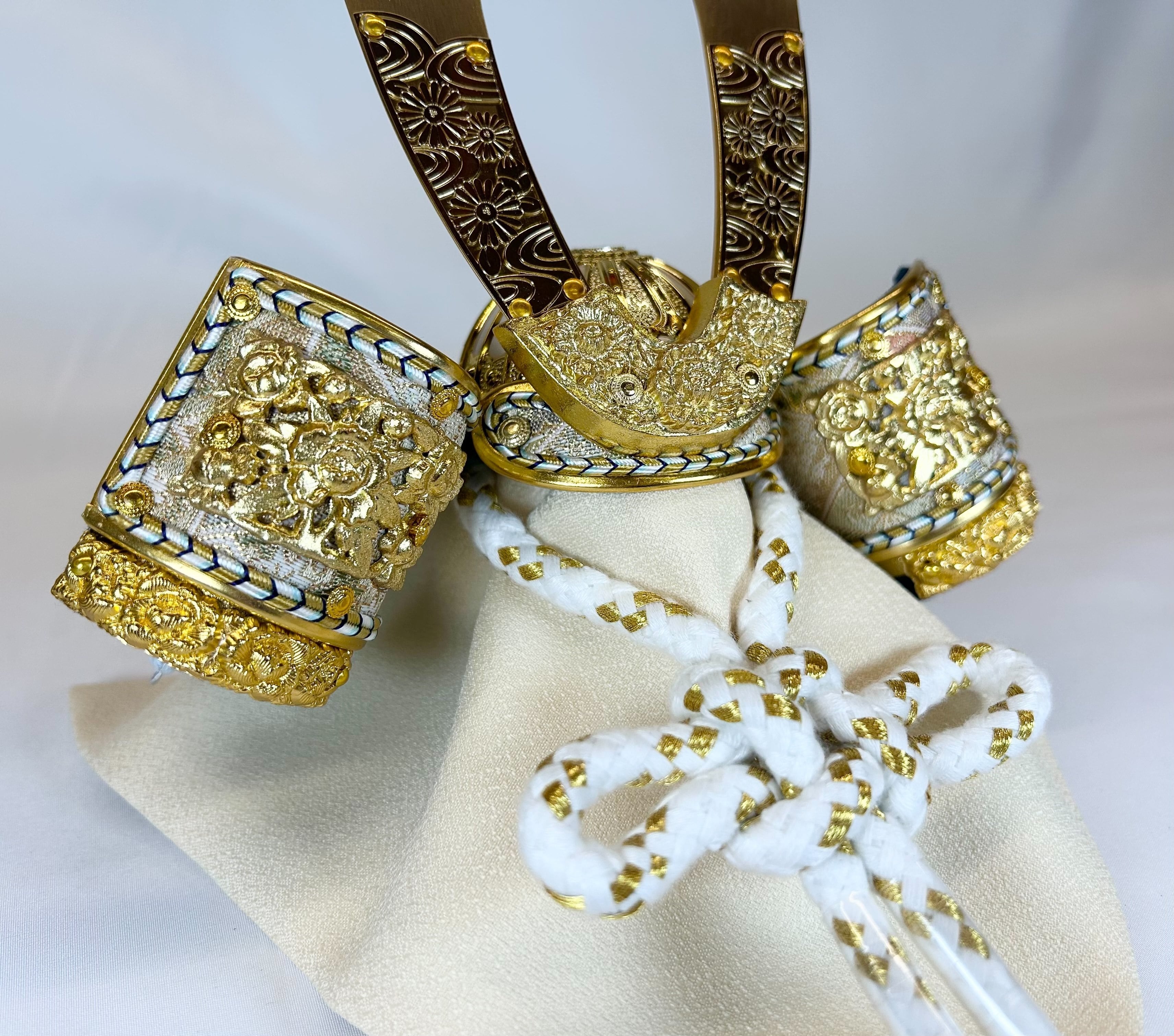 ●白と金色を基調とした中に淡いペパーミントと水色の控えめで上品な兜です。