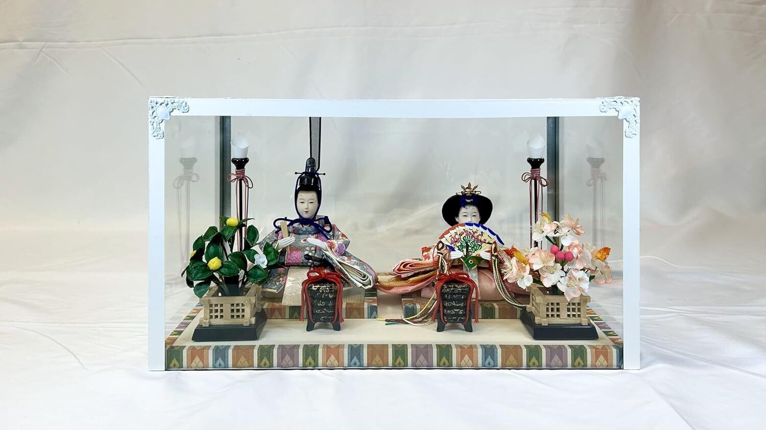 S-79 豆親王A 白枠ガラスケース飾り 燭台 桜橘 貝桶 親王飾り 雛人形 ひな人形 初節句 ひな祭り 桃の節句 小さなお雛様 コンパクト お雛様 海外へのお土産 お祝い 誕生祝い プレゼント 日本伝統 日本文化 日本土産 伝統工芸